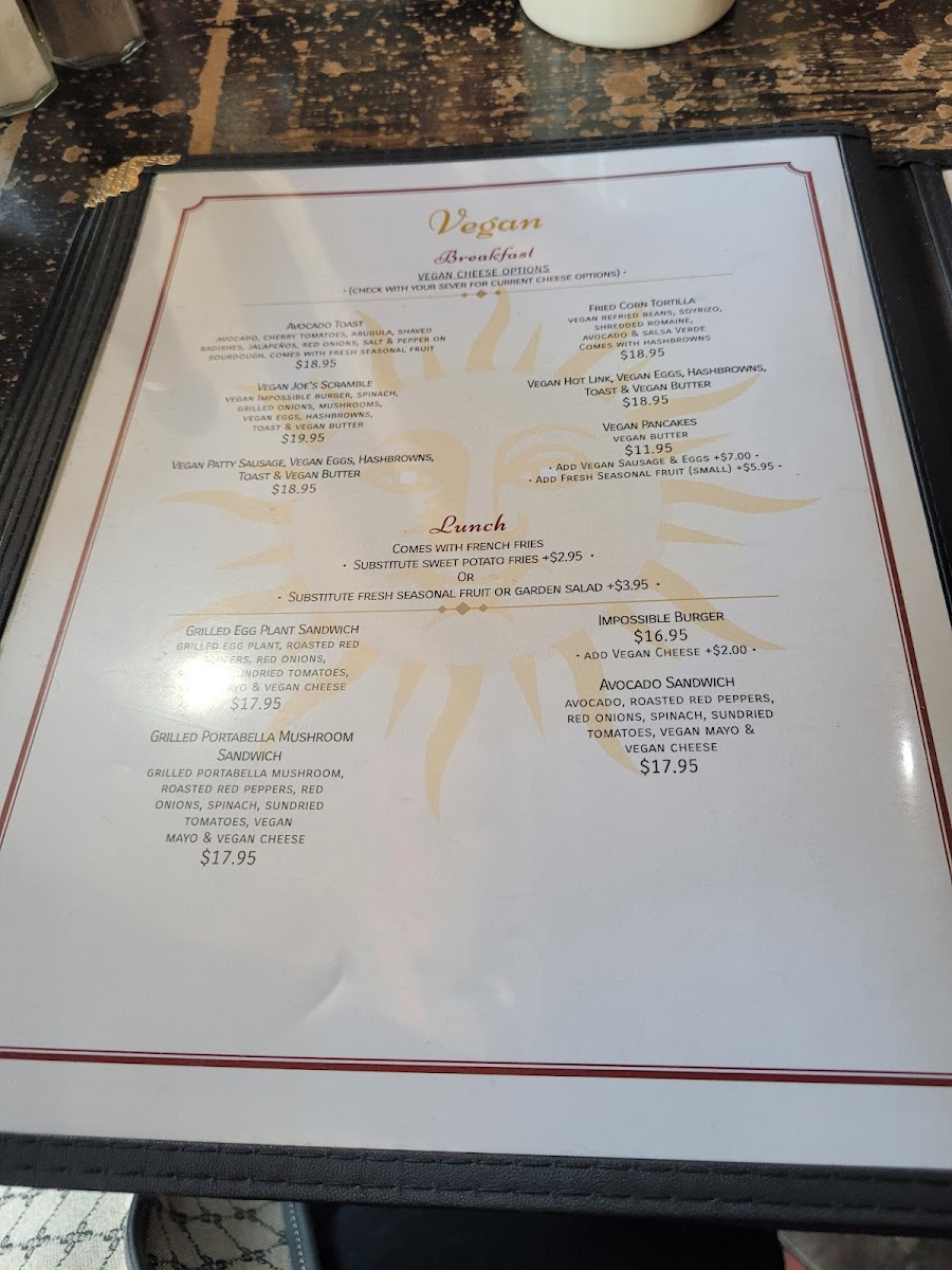 Cafe Soleil also caters to diverse diets with an array of satisfying vegan options. Try the Vegan Joes Scramble or the enticing Grilled Portabella Mushroom Sandwich, perfect for those wanting a delicious morning meal without animal products. The blend of fresh ingredients and innovative recipes makes every bite a delightful surprise.